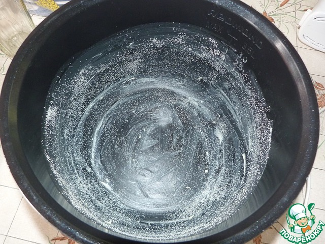 Чашу мультиварки смазать сливочным маслом и слегка присыпать манкой.