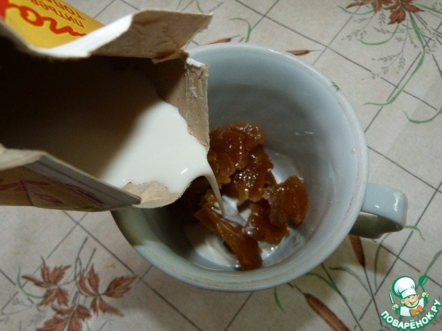 Ближе к окончанию выпечки: положить в чашку 2 ст. л. мёда, залить молоком, и подогреть в микроволновке (или на плите).