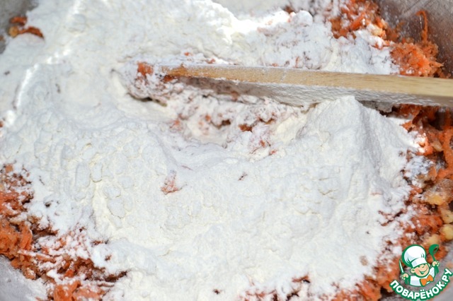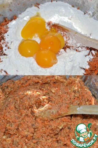 К натертой моркови добавим сахар, орехи и хорошо перемешаем