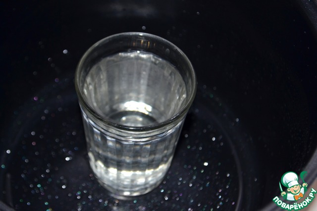 Чашу МВ смажем растительным маслом и в центр поставим граненый или керамический стакан с водой.