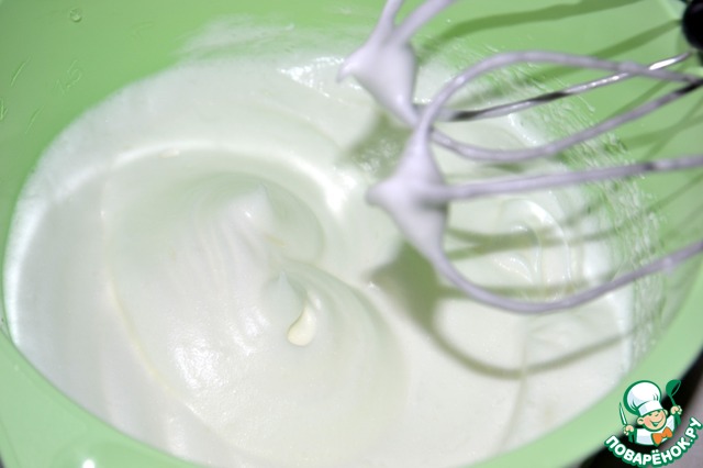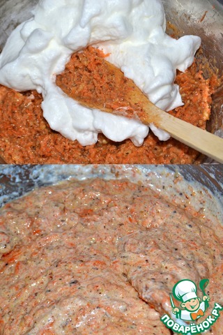 Добавить взбитые белки к вышеприготовленному тесту и аккуратно перемешать тесто