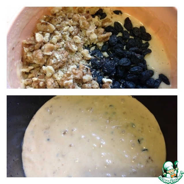 Тесто с орехами и изюмом аккуратно, но тщательно перемешать лопаткой. Чашу МВ смазать оливковым маслом и вылить тесто.