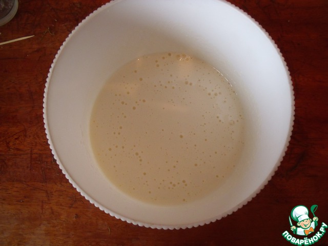 Смешиваем яичную и мучную смеси. Если покажется густой, добавьте сметану или йогурт (пару ложек).