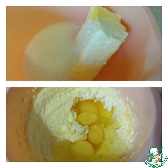 Сахар взбить с мягким маргарином, затем добавить яйца и тщательно взбить