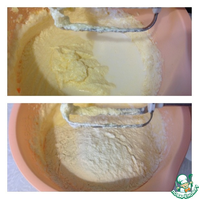 Добавляем разрыхлитель и муку, взбиваем. Тесто густое.