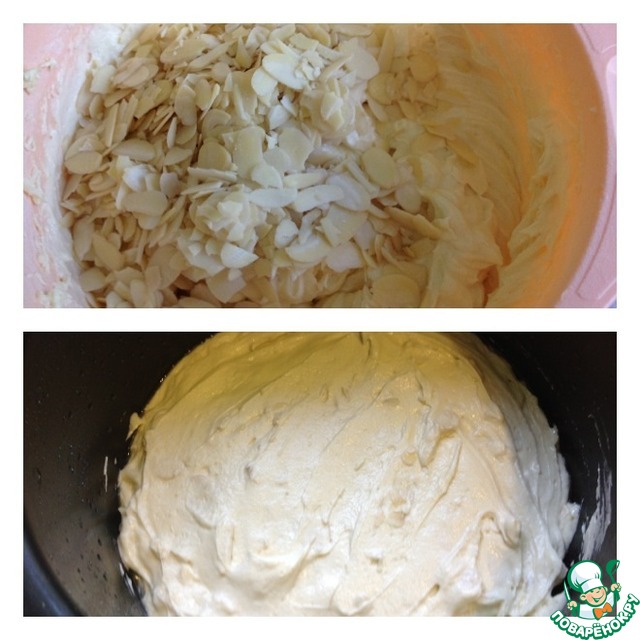 Добавляем миндальные лепестки и аккуратно и тщательно перемешиваем. Тесто выкладываем в чашу МВ предварительно смазанную растительным маслом