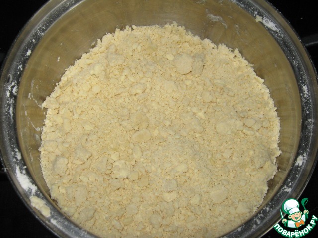 Сначала замесим тесто. Сливочное масло натереть на тёрке, смешать с мукой и разрыхлителем.