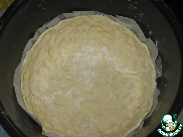 В чашу мультиварки кладём пекарскую бумагу и распределяем тесто по всей поверхности, делая бортики.