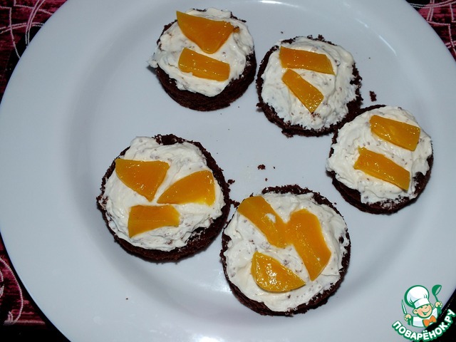 Закрываем вторым бисквитным кружком, сверху также делаем слой сливок, украшаем кусочками персика. Даем время пропитаться и можно угощаться очень вкусными пирожными.