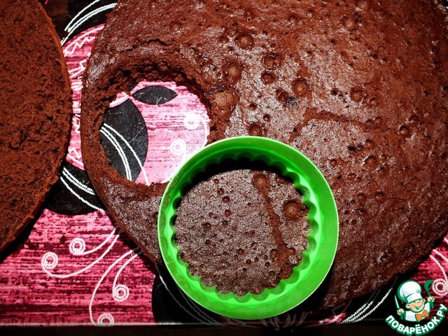 Разрезаем бисквит на 2 части, из каждой части вырезаем вырубкой кружкИ