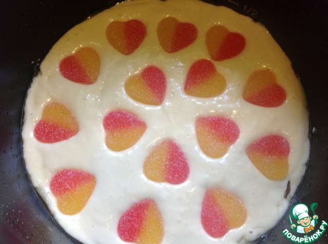 Готовое тесто выложить в чашу МВ смазанную растительным маслом, сверху выложить мармелад. У меня мармелад крупный и тяжелый, поэтому ушел на дно, если хотите этого избежать лучше взять мармеладные тонкие дольки.