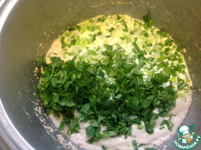 Добавить мелко рубленую зелень, перемешать. Добавить сначала цельно зерновой, затем пшеничной муки, хорошо вымесить, и добавить масло, еще раз немного перемешать тесто