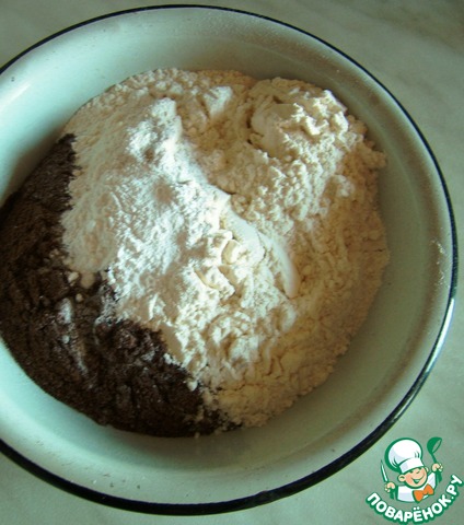 Теперь подготовим сухую составляющую теста: смешаем пшеничную муку с черемуховой и разрыхлителем. Можно использовать только пшеничную муку, увеличив ее количество до 2-х мультистаканов.