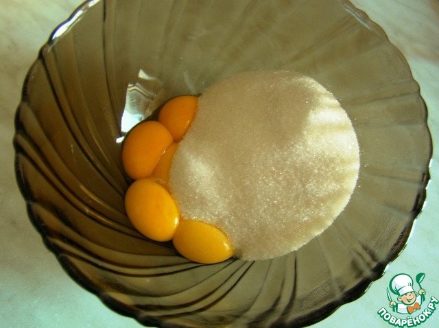 Белки отправляем пока в холодильник. В желтки всыпаем весь сахар и взбиваем до увеличения в объеме и полного растворения сахара.
