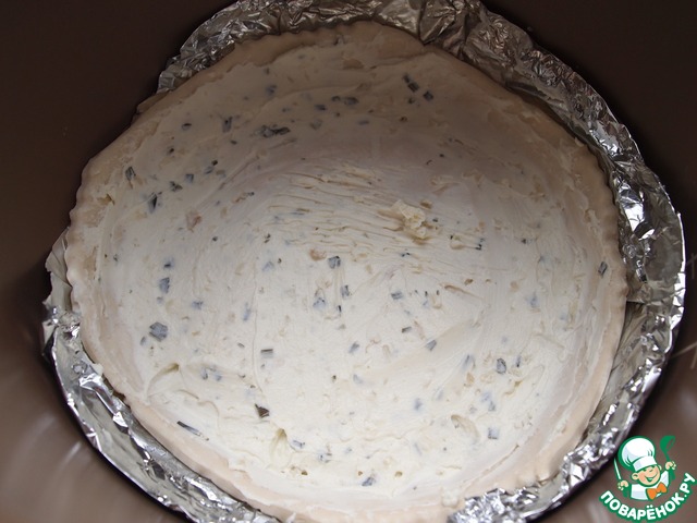 Распределить творожный сыр (у меня с зеленью) по тесту.
