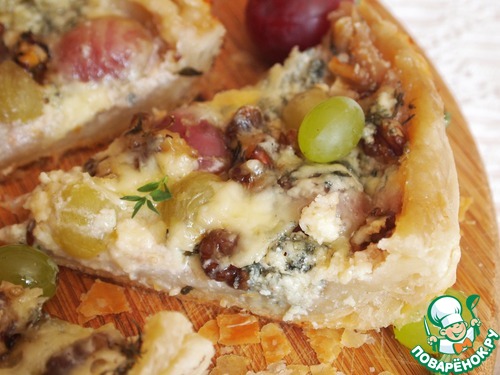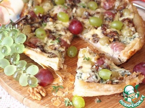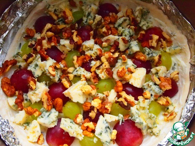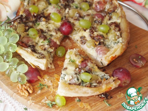 Готовую пиццу аккуратно вынуть, с помощью фольги, из чаши мультиварки. Украсить свежим виноградом и можно подавать к столу.