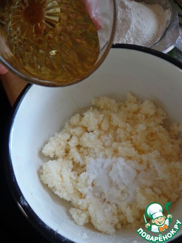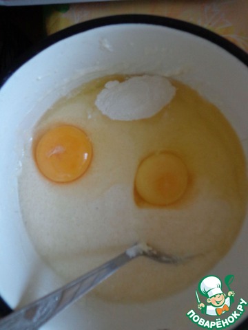 Творог взбить с яйцами (2 шт), добавить сахар - 10 ст ложек, ванилин- половину пачки (пачка 1,5 г), крахмал 2 ст. л. и перемешать. Если творог не однородный, а зернистый, то его лучше протереть через сито.