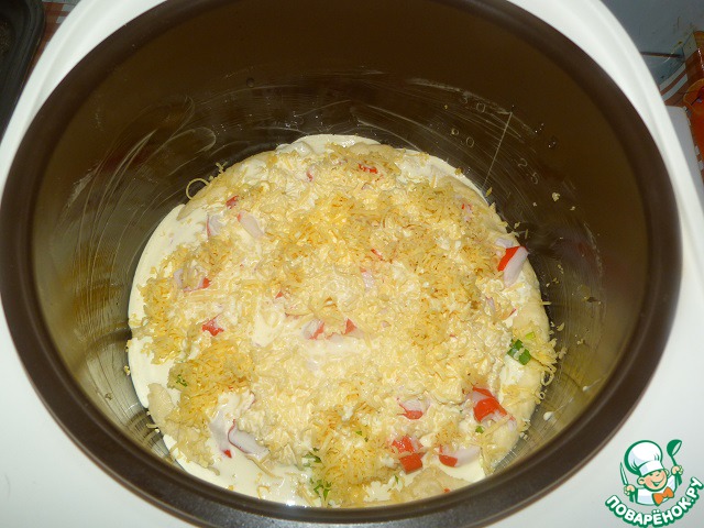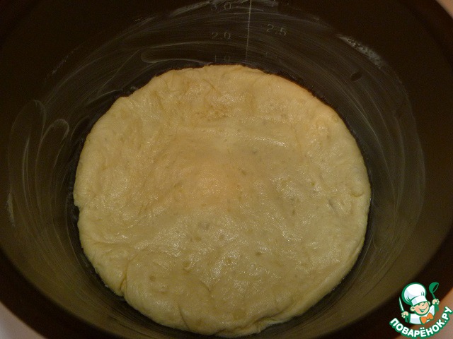 Яйца, сваренные вкрутую, нарезать. Затем их выложить на картофельное тесто в мультиварку