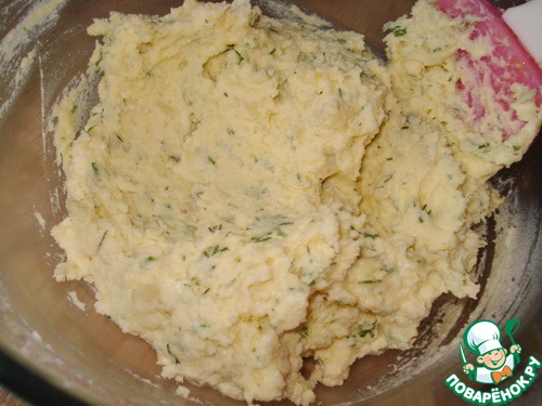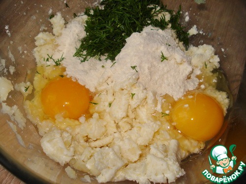 Отварить картофель, слить воду и протереть через сито или просто помять. Так же протереть творог. Добавить яйца, соль, муку, укроп, разрыхлитель.