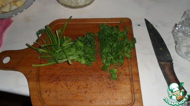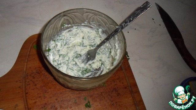 К творогу с яйцом и содой кладём зелень и плавленый сырок, тщательно перемешиваем, соль по вкусу.
