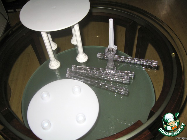 Поставили на 1этаж торт- далее на торт прикладываем обратной стороной подставку- она оставит выемки куда в дальнейшем мы втыкаем столбики прямо в торт,и так далее.