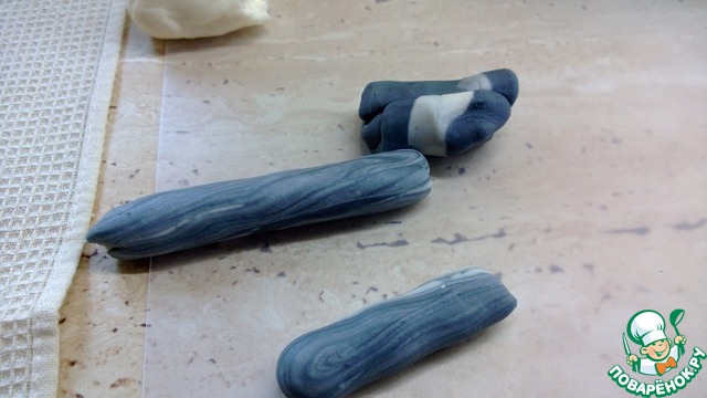 Вымешиваем мастику для брусчатки. Серую и белую мастику соединяем - две полоски - и скручиваем в жгут.