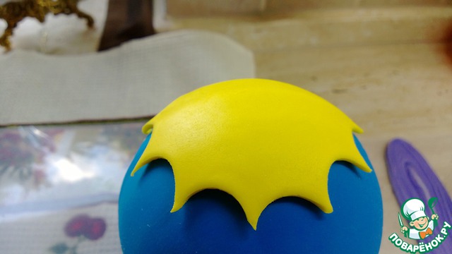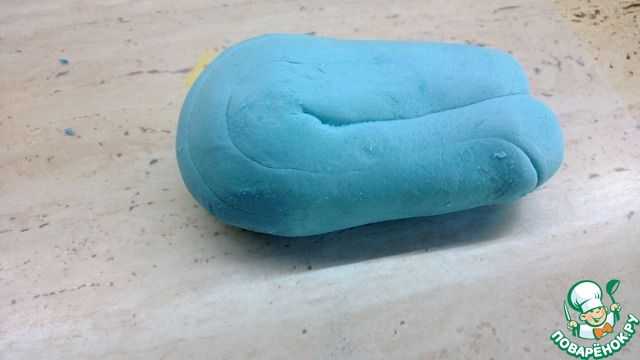 100 гр маршмеллоу и 1 ст. л. сливочного масла поставить в свч на 30 сек., потом постепенно добавлять 250 гр сахарной пудры и вымешивать массу до состояния отлипания от рук. Положить готовую массу в холодильник на пару часов. Достать из холодильника и еще раз размять до комнатной температуры. Работая с мастикой, посыпайте стол и руки крахмалом. Добавить голубой краситель и снова вымесить до однородности цвета.