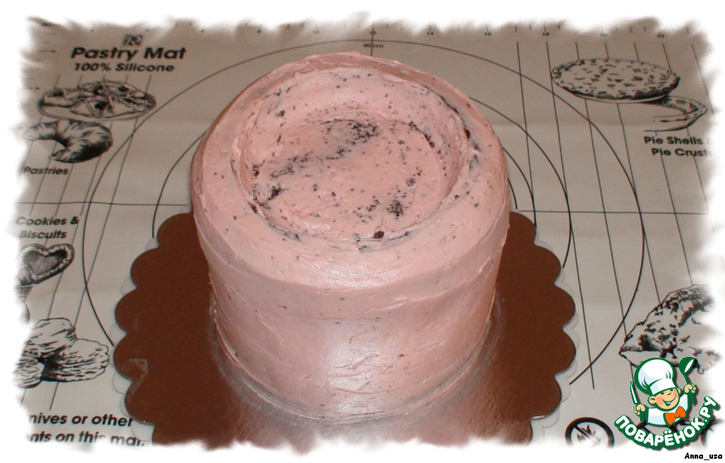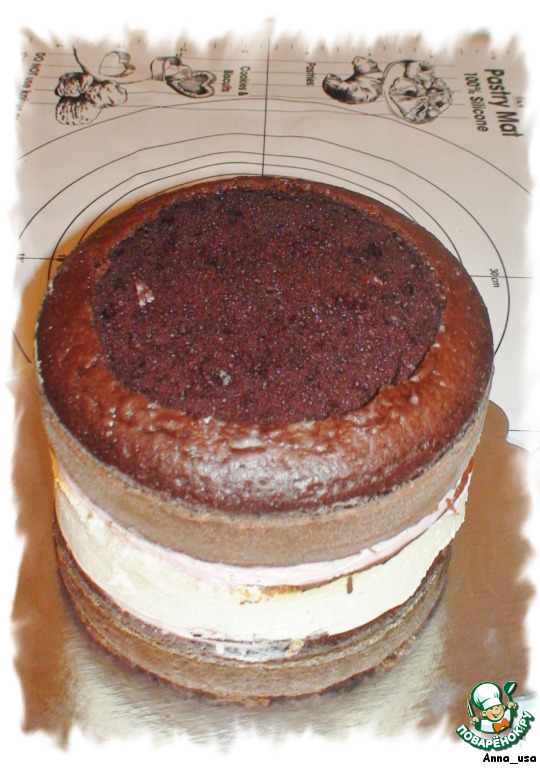 Теперь на верхнем корже, отступив от краёв сантиметра 1,5, вырезаем круг так, чтобы получилось углубление.