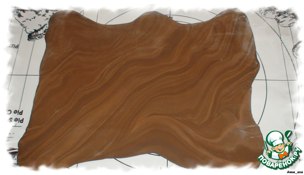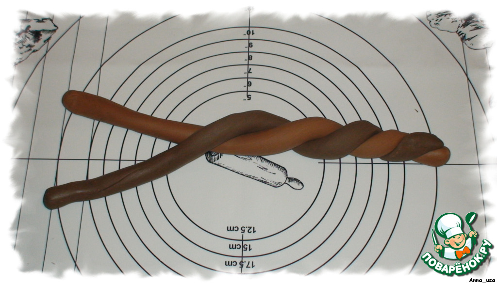 Теперь займёмся мастикой. Нам понадобится 2 кусочка: один - тёмно-коричневый, другой - светло-коричневый. Окрашиваем мастику пищевой краской до нужных цветов. Скатываем две колбаски и переплетаем их.