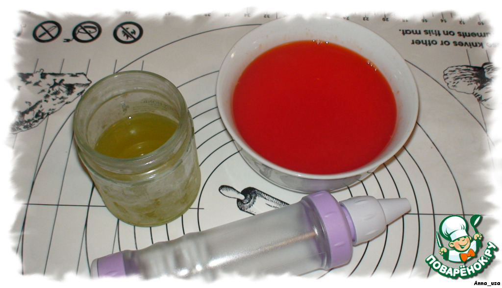 Теперь очередь "икры". Для этого нам понадобится желе, растительное масло и шприц (у меня кондитерский, но можно использовать и обыкновенный).