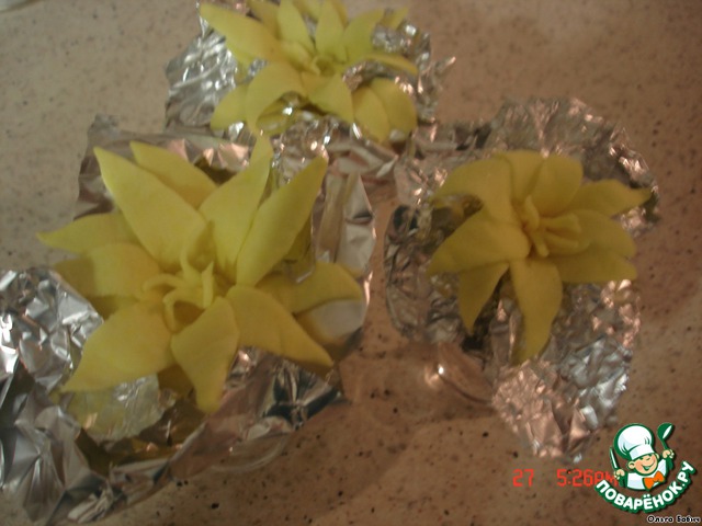 Вставляем в серединку, теперь обязательно проложим наши листики бумагой (я это сделала фольгой), иначе они слипнутся! Белок нам нужен для склеивания между собой листиков.