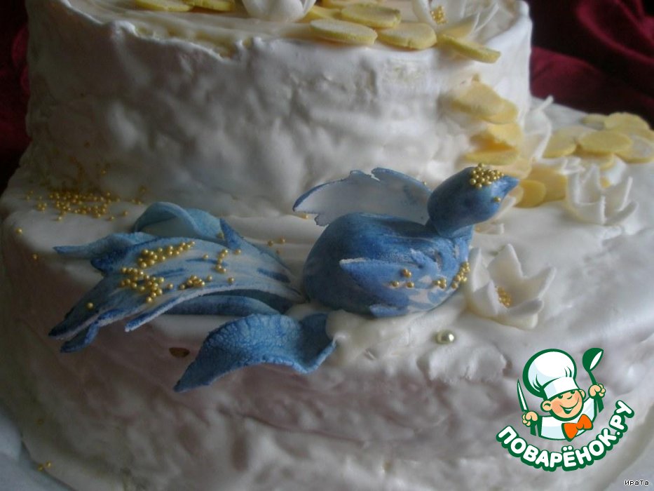 Птица из белой мастики покрашена после высыхания пищевой краской.