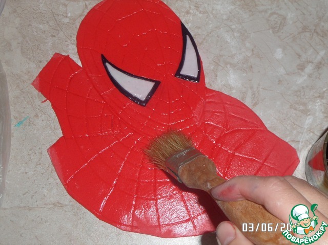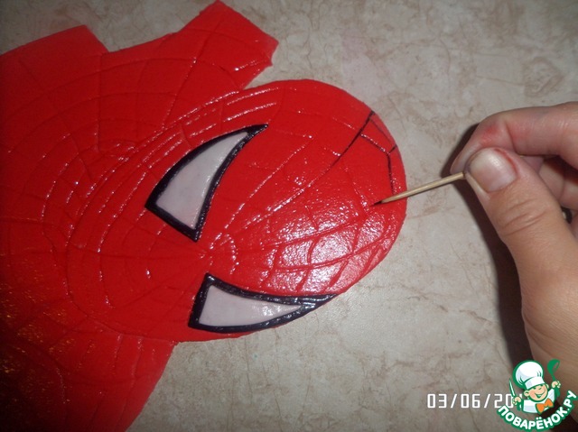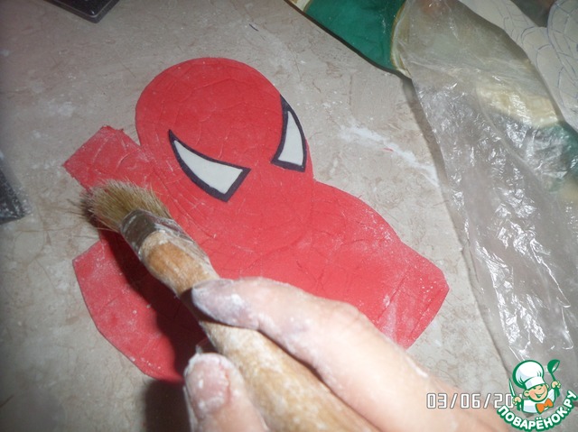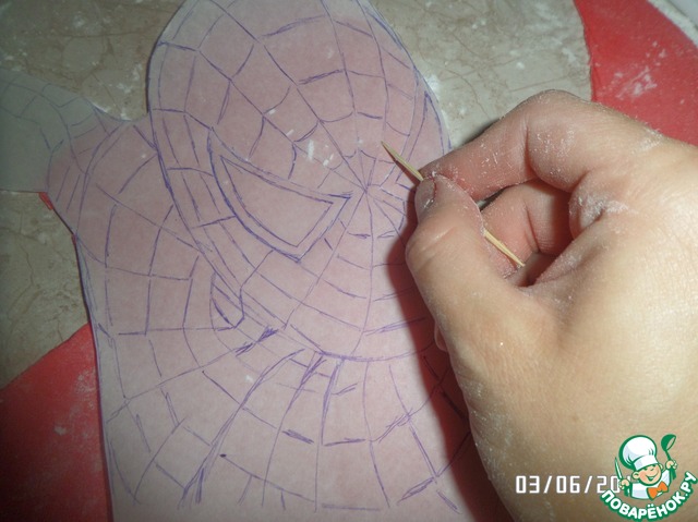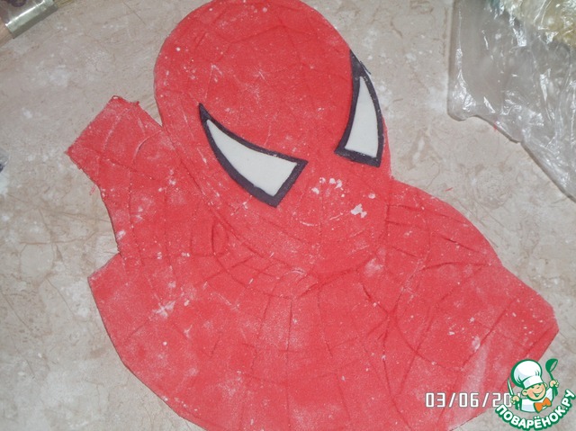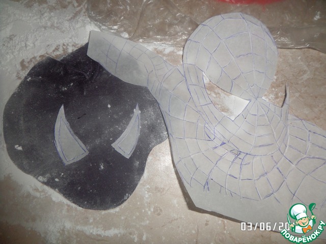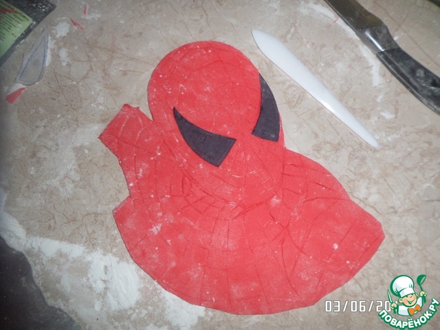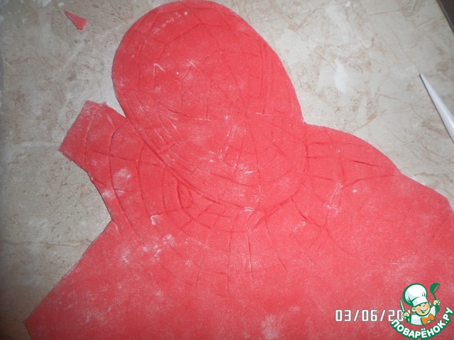 Заранее приготовила шаблон человека паука. Перевела с монитора компьютера, т. к. не было возможности распечатать. Прикладываем к раскатанной мастике и обрезаем по контуру.