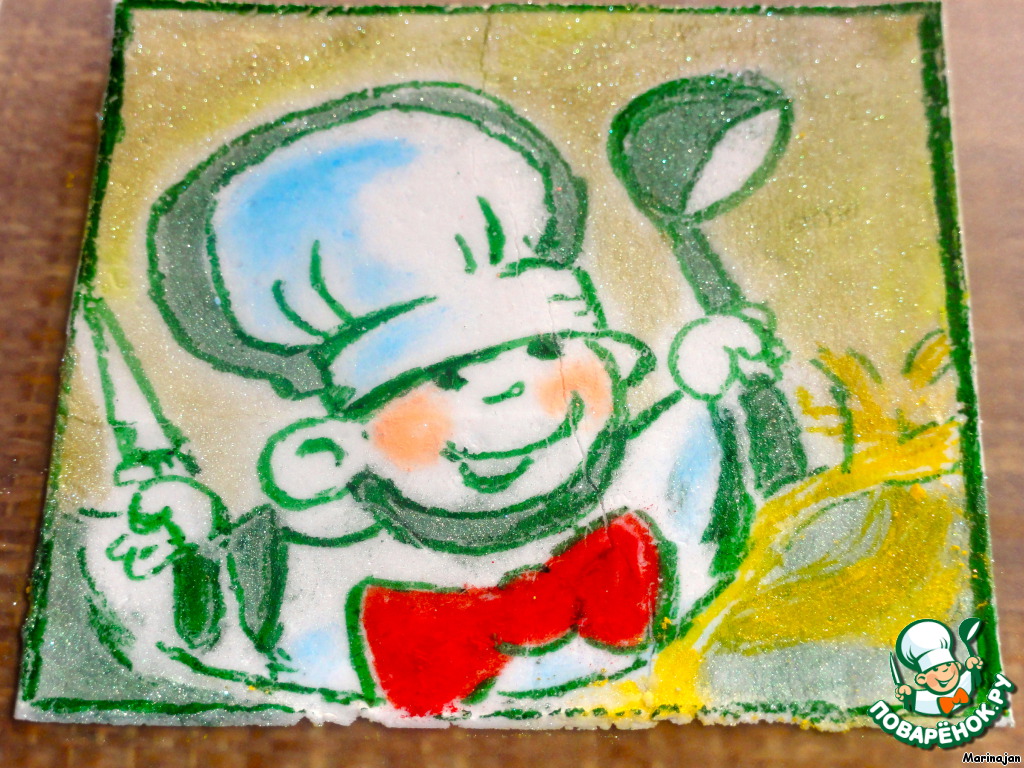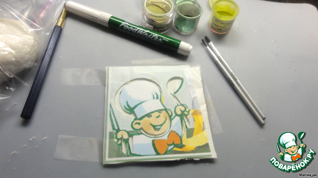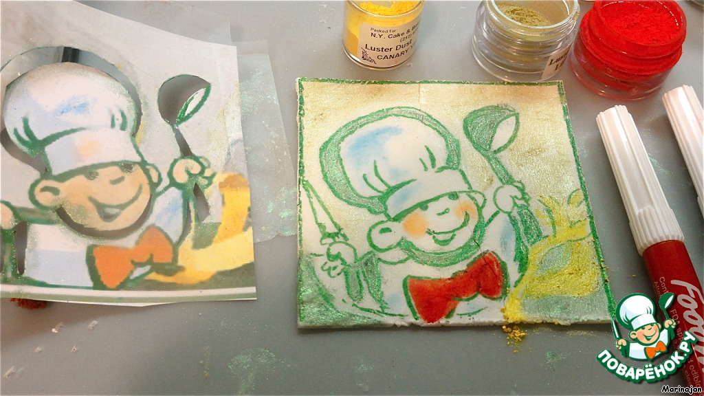| Очень простой и красивый способ украшения торта, цветами из мастики. Через трафарет, сухой кисточкой наносим пищевые красители. Осторожно снимаем трафарет и вырезаем. Оставляем просушиться и белком приклеиваем к торту. Легко и эффектно. Заходите, увидите какой у меня получился Поваренок по этой технике. |