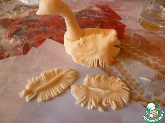 Из кусочка мастики вылепить фигурку птички. Под шею лебедя я поставила коробочек с салфеткой, чтобы ровно подсохла.