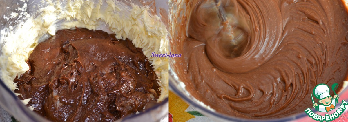 Взбить добела сливочное масло. И постепенно добавить в масло шоколадную смесь. Взбиваем до однородности.