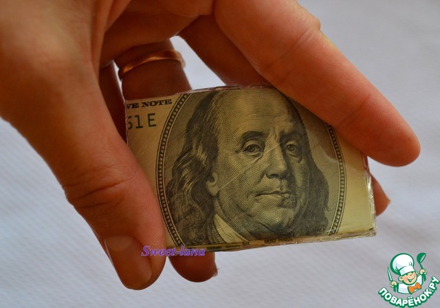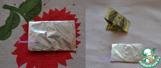 Тем временем я делаю экран. Из картона вырезала прямоугольник, обернула его в фольгу. 100 долларов свернула так, чтобы они поместились на мой экран. Поместилось только лицо Бенджамина Франклина.