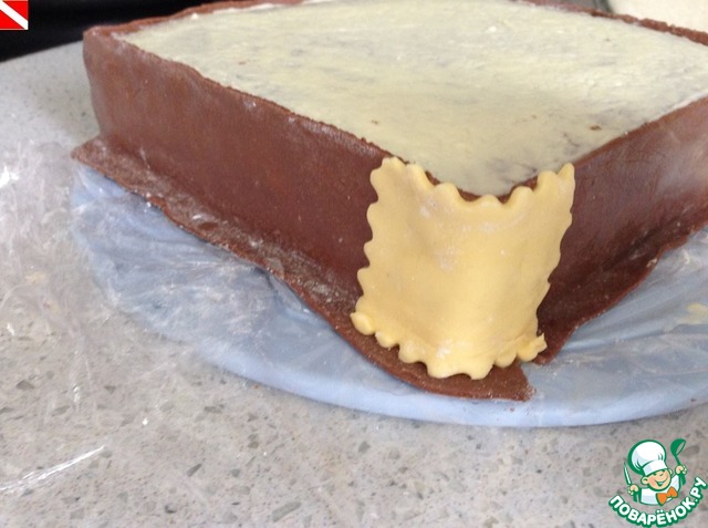 Теперь нам необходимо сделать бока тортику. Раскатываем коричневую мастику (путем проб и ошибок я пришла к выводу, что мастику сначала лучше раскатать до желаемой ширины, а потом уже растягивать до нужной длины). В нашем торте вдлину можно раскатать чуть больше-чуть меньше, т. к. декоративные уголки закроют швы.