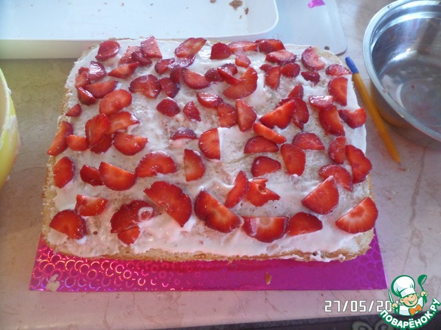 Бисквит у меня ванильный шифоновый (рецепт на сайте уже есть). Разрезала его на 4 коржа, прослоила кремом из йогурта и сливок. Добавила порезанную клубнику. Отправила в холодильник.