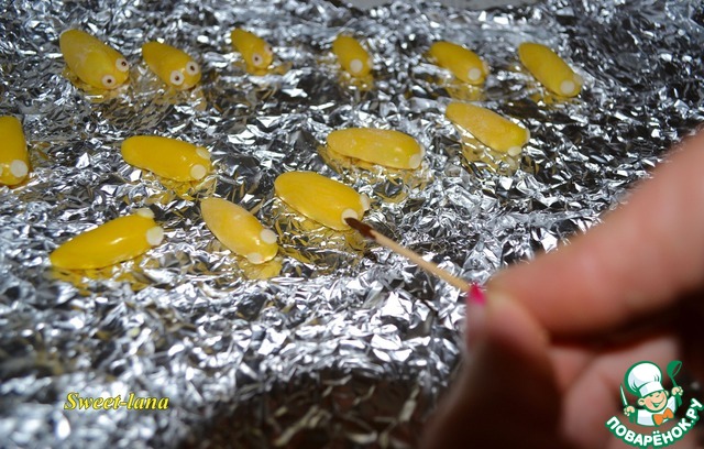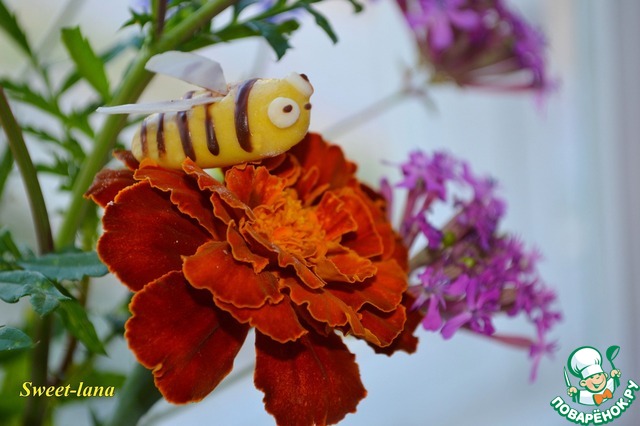 Из желтой мастики лепим фигурки пчел. Покрываем их медом с водкой для блеска.