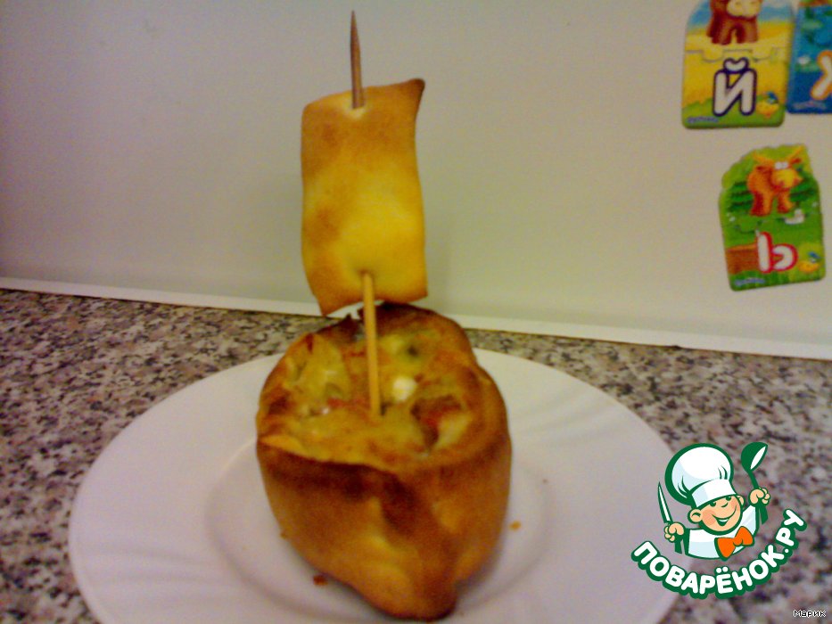 Делаем тесто на пиццу (мука, размягченный маргарин, яйцо, молоко, соль - все круто замешиваем, чтобы лепить было легче). Из теста лепим кораблик и парус. В кораблик выкладываем начинку (все что есть в холодильнике - колбаса копченная, соленный огурец, маслинки, помидоры, яйцо варенное - все мелко режем). Посыпаем тертым сыром.
