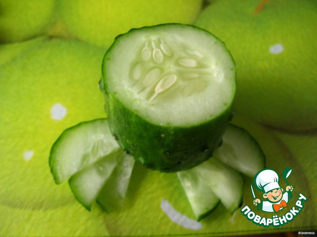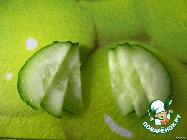 Свежий огурец помыть, обсушить и нарезать на кусочки. Делаем один ломтик 3 см, четыре ломтика по 0, 5 см, один ломтик - тонким и полупрозрачным, чтобы можно было согнуть пополам.
