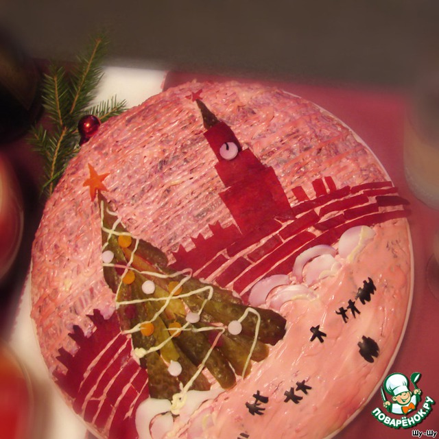 Это кажется, что сложно - на самом деле все просто - немного фантазии и таким образом можно украсить любой салатик, к любому празднику. Главный принцип - это мозаика из тонко нарезанных овощей: свеклы, морковки, соленого огурца, а так же яйца, человечки вырезаны из маслин, каток залит майонезом и разглажен ложкой.