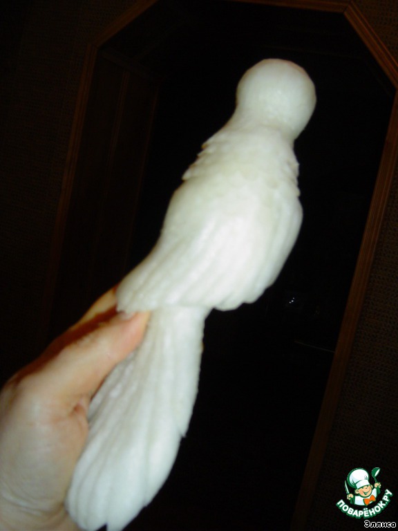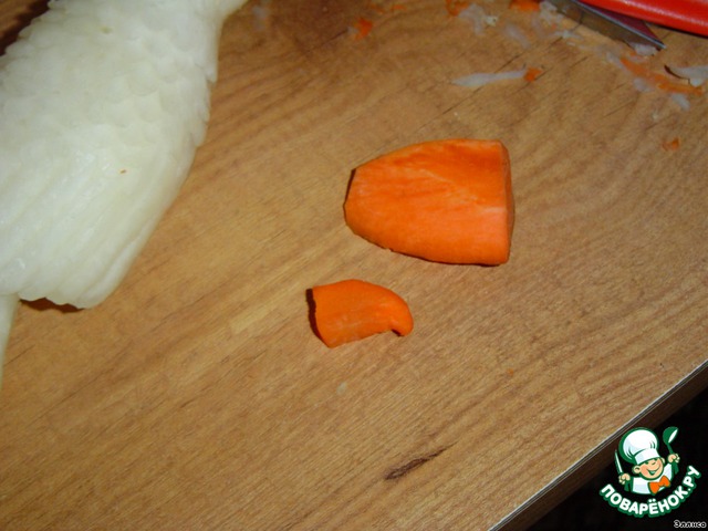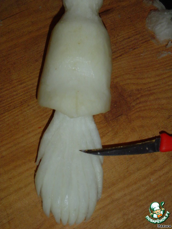 Ножом счищаем редьку, формируя тельце. Подчищаем мякоть под будущими крыльями и хвостом.