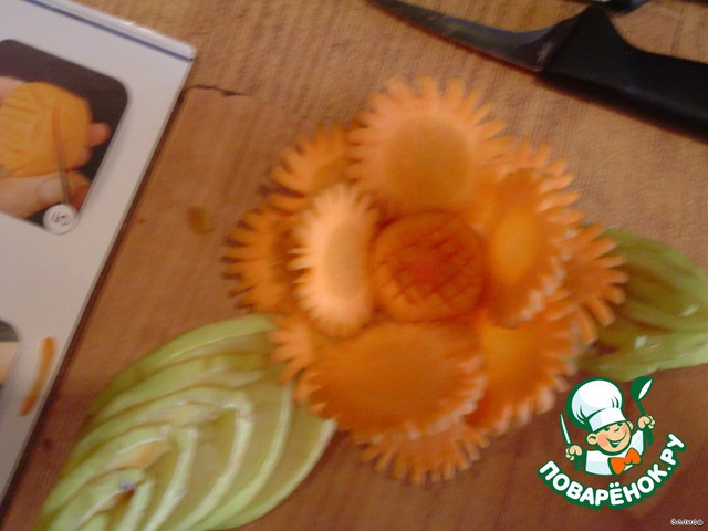 | Такой цветок послужит вам отличным украшениям как для салатов, так и для основных блюд. А прелесть этого цветка состоит еще и в том, что его может сделать любой и для этого не потребуются специальные ножи. |