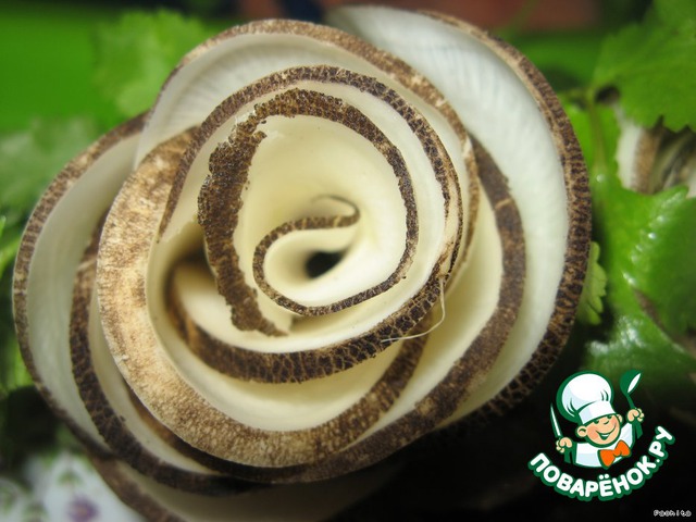 | Довольно несложное украшение из черной редьки. По такому принципу можно делать цветы практически из любых овощей. |