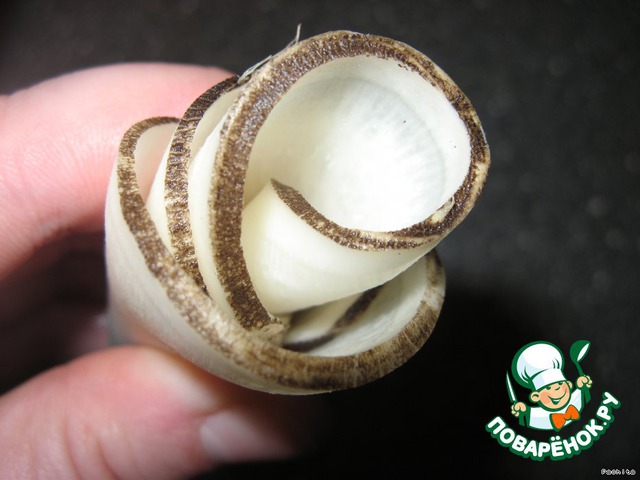 Нарезать тонкими кружками (я нарезала обычным ножом), положить в соленую, холодную воду, на 15-20 минут, чтоб ломтики стали податливее и мягче.