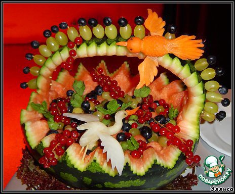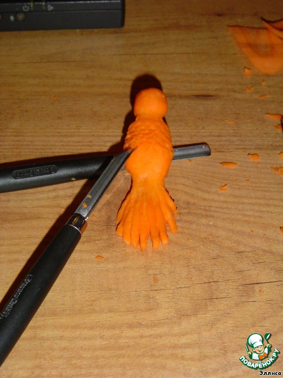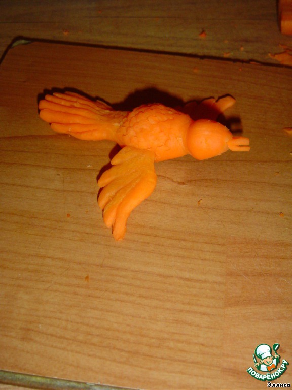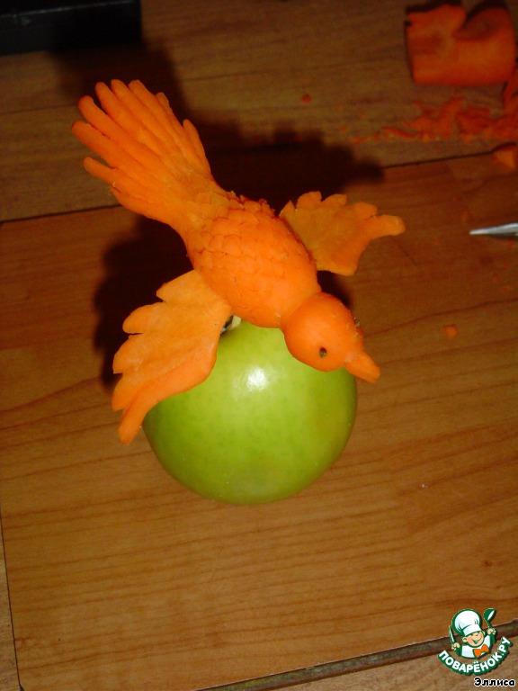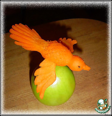 | Это подружка моего попугайчика (его можно увидеть здесь - http://www.povarenok.ru/recipes/show/35116/), только не из редьки, а из моркови. Такая птичка может украсить Ваш праздничный стол и порадовать детей! |