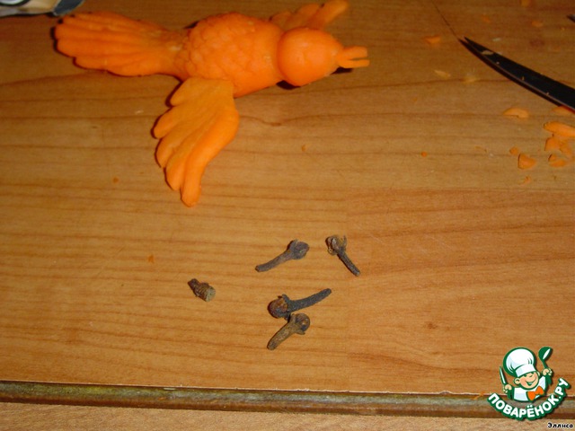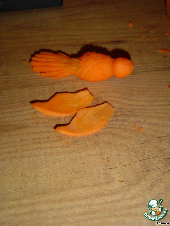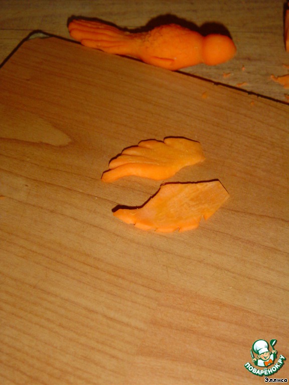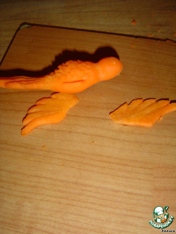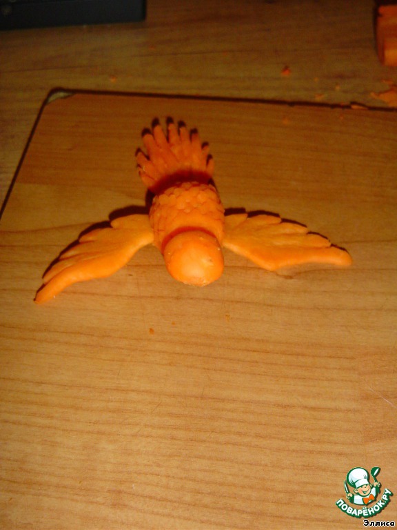 Из обрезанной ранее моркови срезаем две пластинки и придаем им форму крыльев.