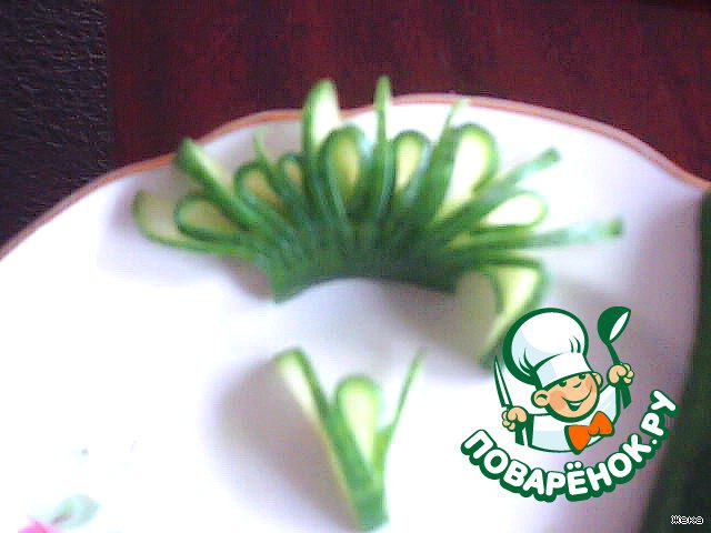 Остаток огурца просто шинкуем очень тоненько и выкладываем листочек (или что фантазия подскажет).
